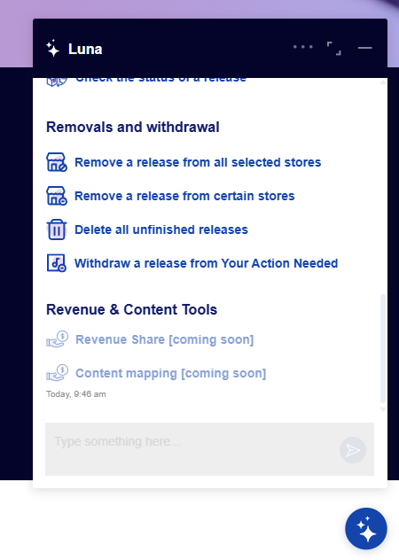 The quickest way to remove content is via Luna, our support assistant, located in the bottom right corner of the RouteNote site.