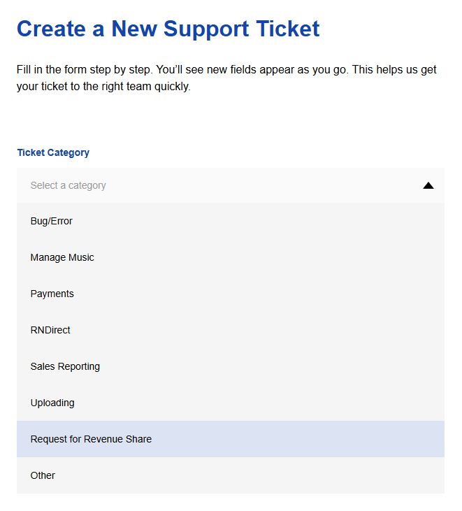 There are two different ways that you can request revenue shares for your music, through our site or by creating a ticket.