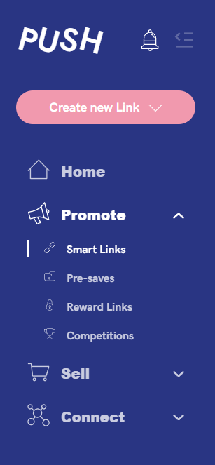 1. From your dashboard, head to the promote on the left-hand side of the page. Click on whichever feature your link falls under. In our example, we are editing a Smart Link, so we would head to our Smart Link section which at the top. Remember though, you can edit any of your PUSH links.