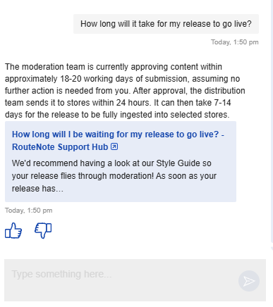 While you are still welcome to contact us directly, Luna offers a speedy alternative to any questions which you may have about RouteNote. You can find Luna in the bottom-right corner of our homepage, via the sparkle icon. Also, you don’t even need to be signed in to an account!